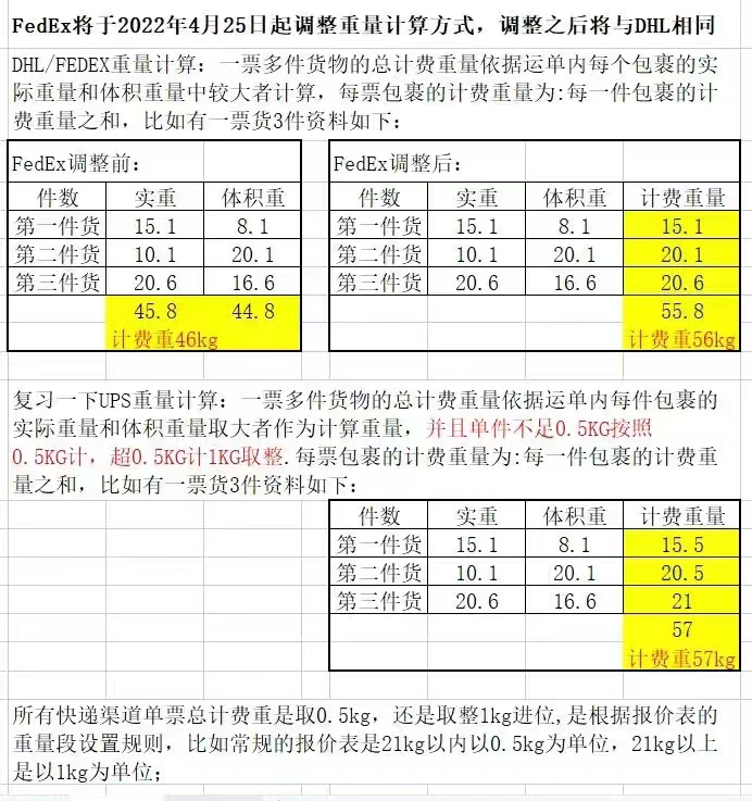 接联邦通知,联邦对于一票多件货物计费重规则调整为按每件实重材积重对比后取大者作为计费重,再将每件计费重相加得总计费重后再进位,此规则适用于我司所有联邦渠道(不管大陆还是香港),生效时间从2022年4月16日09:00起,请及时通知客户知悉,谢谢!(与DHL计费重规则一致),详情见下图示例!
